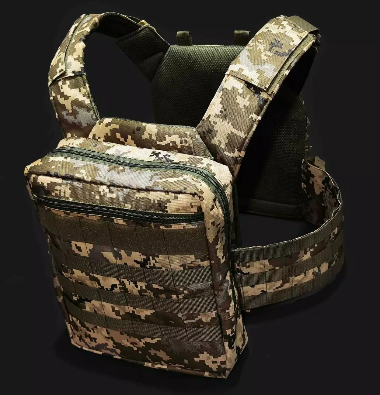 Рюкзак кріпиться позаду плитоноски не заважаючи виконувати завдання та переміщення.